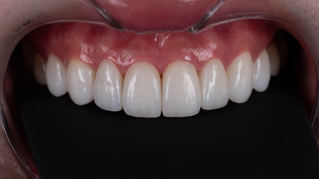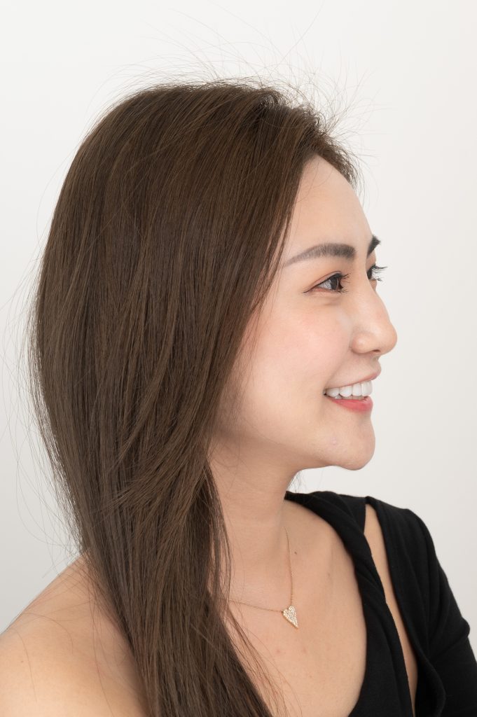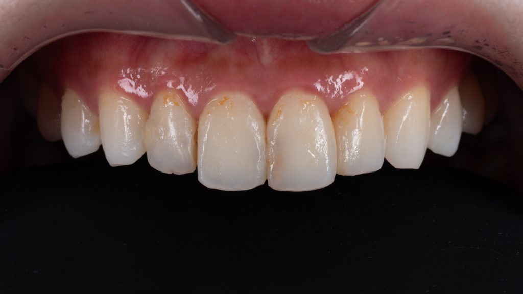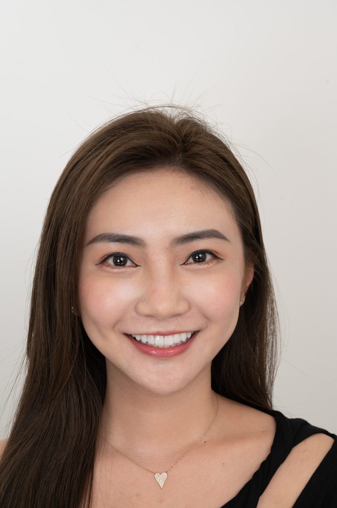 病患Y小姐因矯正期間難以清潔牙縫,導致蛀牙填補處出現斑駁、色澤不均,且讓牙齒形狀、對稱性難以滿意呈現